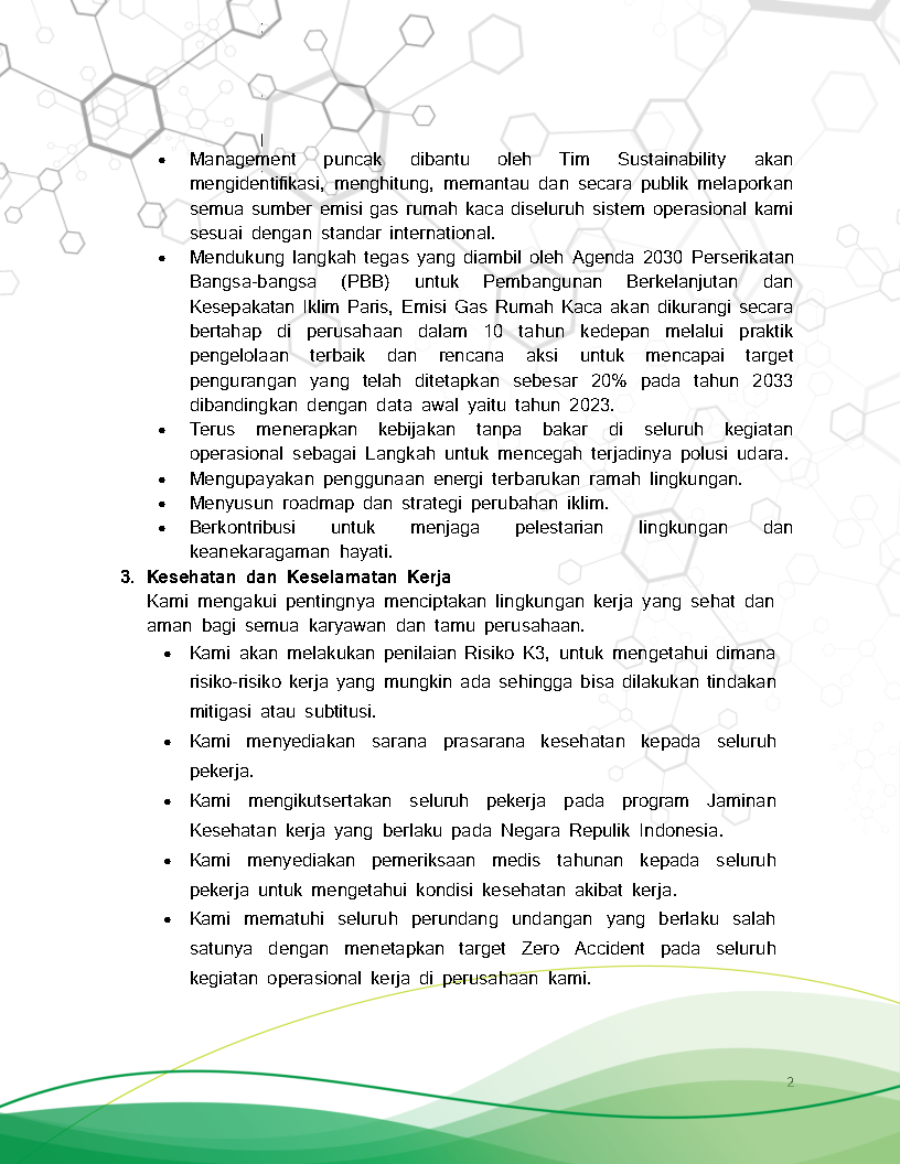 Through this policy, we are committed to implementing the concept of sustainability in every aspect of our business and operations. As part of the global effort to reduce greenhouse gas emissions, we are determined to support government programs and international initiatives through best management practices.